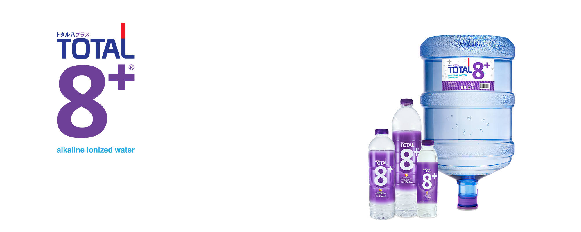 Merupakan inovasi terbaru, TOTAL 8+ adalah air mineral alkalin yang memiliki manfaat untuk konsumen yang peduli terhadap kesehatannya setiap hari. TOTAL 8+ diproduksi dengan proses ionisasi yang mengubah air mineral biasa menjadi air mineral yang bersifat alkali (basa). TOTAL 8+ sangat baik dikonsumsi untuk konsumen yang memiliki mobilitas tinggi serta kurang mengkonsumsi buah dan sayur, selain itu TOTAL8+ juga sangat cocok program detoksifikasi.